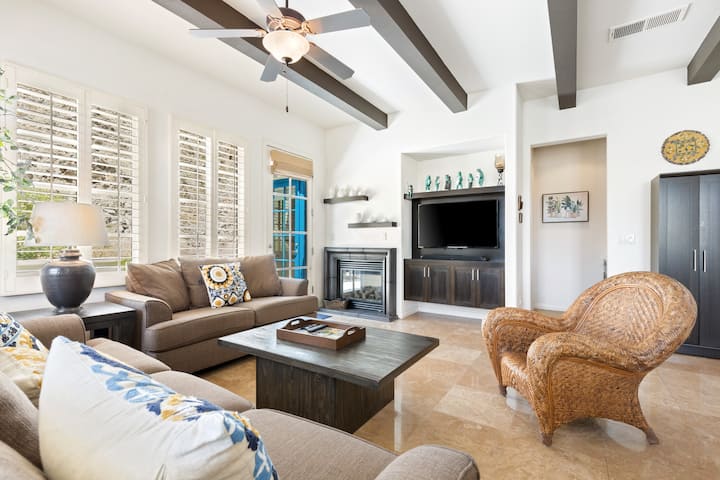 As the private access gates close, you're immediately immersed in the luxury of Legacy Villas next door to the renowned Waldorf Astoria La Quinta Hotel. In this end unit, you can enjoy the Santa Rosa Mountains, where you might see a mountain goat, directly outside your private patio equipped w/ gas fire pit. The townhouse has 3 suites, each complete w/ full bath & king bed. 2 of the 12 pools are easily accessed at the end of the driveway.